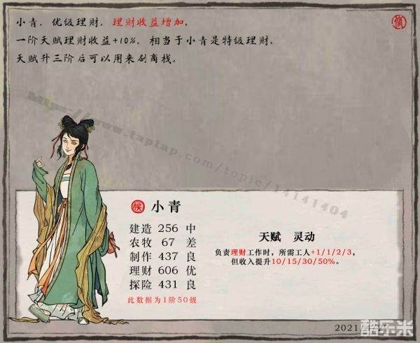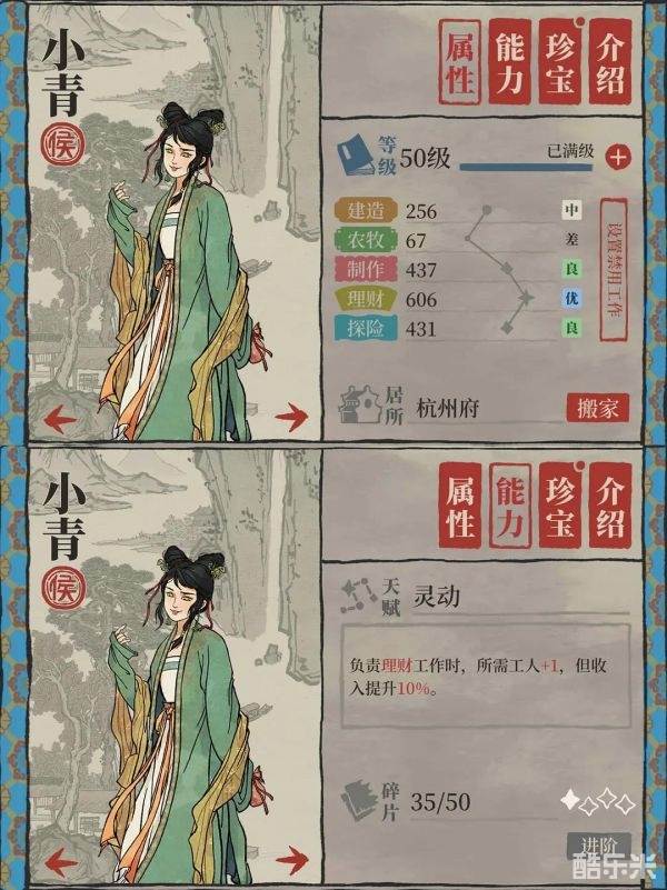 满级属性:建造256,农牧67,制作437,理财606,探险431