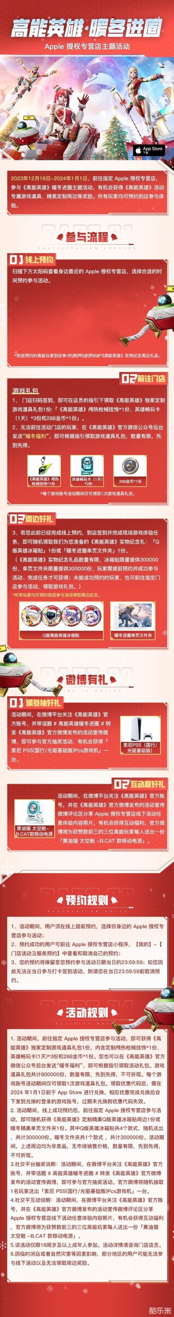 《高能英雄》 × Apple 授权专营店梦幻联动,双厨狂喜,“果”然“高能”!2023年12月18日-2024年1月1日,所有玩家都可前往指定 Apple 授权专营店参与活动体验游戏,福利拉满,超多惊喜奖励拿到手软!