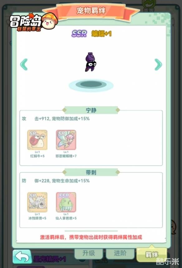 最后要介绍的是木妖,别看它只是SSR级宠物,但它能够带来攻击、防御和生命的属性加成,并且对中毒和灼烧的抗性增加15%,随着不断进阶,其加成效果也越来越强。所以开荒必备好宠了。