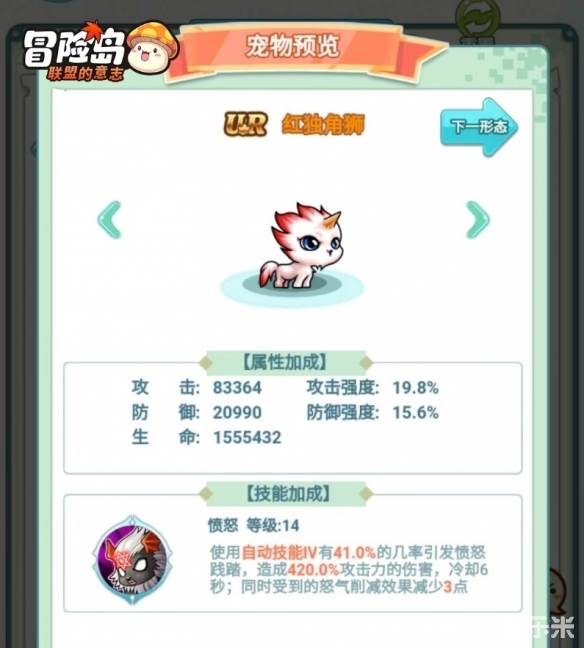 首先第一个要介绍的萌宠是红独角狮。红独角狮在《冒险岛OL》中可是高人气怪物,很多冒险家都想养上这么一只,《冒险岛:联盟的意志》帮大家实现了这个愿望,红独角狮做成了宠物,它的强度肯定不用多说,它独特的伤害技能加成能给玩家带来质变的游戏体验!