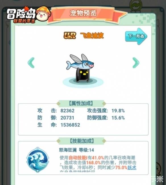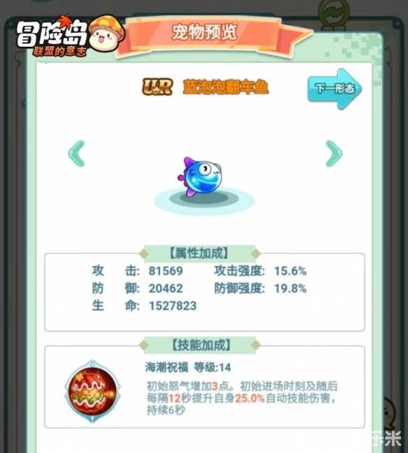 第三个介绍的是蓝泡泡翻车鱼,别看它一幅呆呆软萌的样子,它可是能成为冒险家强大助力的好伙伴,它不仅能增加冒险家的怒气值,还能提升高额的技能伤害,实力不容小觑!
