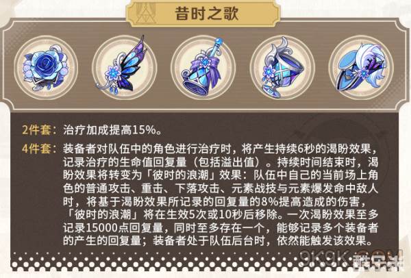 4.已经有了海染套的还有必要去刷这个吗,答案是没必要。昔时套有个比较令人难受的一点是,如果你的队伍是单核阵容,诸如神鹤万心这种的,那么你就一定要对轴,不能在触发效果之后让别的角色把增益给吃了,还有,法器奶不能带讨龙,因为讨龙需要10秒内打完爆发,而昔时套触发效果要在6秒以后,这就让人很难受了。