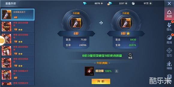 装备升阶需要消耗对应部位的装备源晶。看到这可能有的小伙伴会担心,装备升阶是不是需要氪很多金,恰恰相反。升阶所需要的材料可以在都市猎魔、装备任务、都市猎场以及连服BOSS里获得。获取的难度极低,只要把每天日常的次数刷完,就能获取到非常多的培养材料,战力也就蹭蹭的上涨了!
