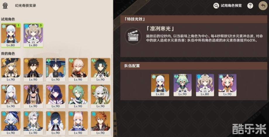 推荐积分倍率选择1倍,选择神里绫华充分利用特技光效来快速清怪,建议加入风系角色聚怪,例如砂糖万叶温迪,然后用芭芭拉战技快速为敌人挂水。罗莎莉亚增伤或迪奥娜来辅助套盾挂冰。