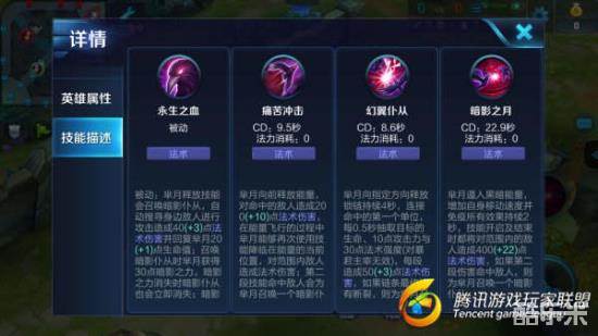 暗影之月(三技能):芈月遁入黑暗,增加移速同时获得免疫所有伤害的效果,技能开启和结束时都会对范围内敌方造成一定的伤害。被动效果强化了芈月的普通攻击,使得每次攻击都会获得暗影值,造成法术和控制效果。
