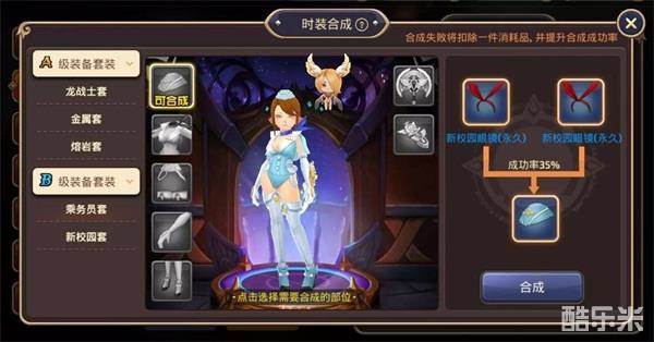 如下图所示,冒险家们在选定要合成的时装部位后,放入可参与合成的时装点击合成就可以了。合成成功将扣除两件消耗品时装并获得更高品质时装或同品质时装,而合成失败将随机扣除一件消耗品时装,但合成失败后将会提升目标时装合成的成功率。