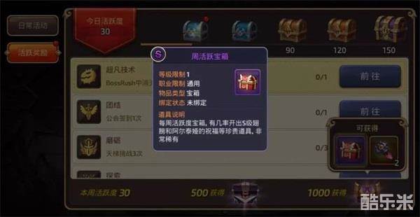 冒险家们只要达到要求就可以领取对应奖励,C叔可以小小透露一下,周活跃宝箱可是有几率开出S级翅膀和阿尔泰娅的祝福等珍贵道具哦~