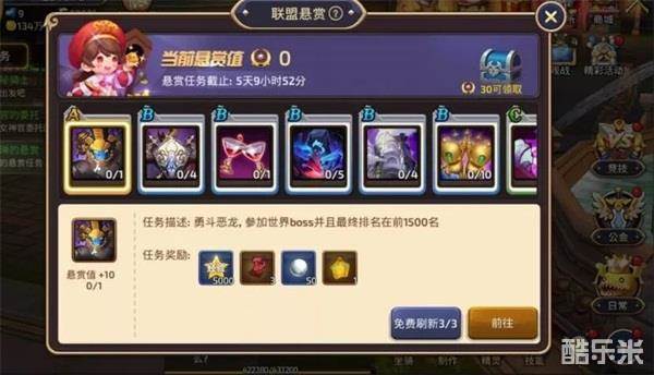 悬赏任务分C、B、A、品质,品质越高奖励越好,而冒险家们每日拥有免费刷新任务次数,每日凌晨5点重置刷新,所以可以等刷新到高品质的任务再接取,不过冒险家们需要注意,悬赏任务每周一凌晨5点会重置,所以接取后,请尽快完成!