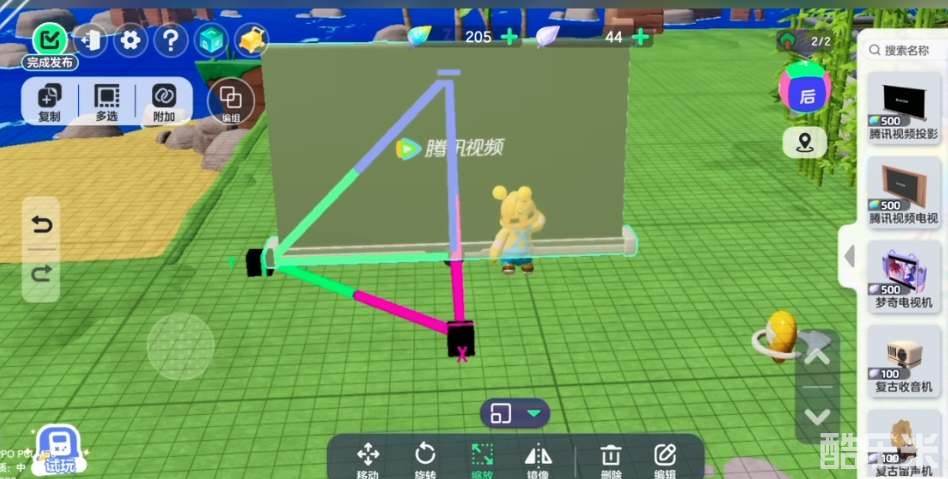 3、电影院最核心的就是【投影机】了,把投影机放到场景内,然后点击投影机,选择下方的【缩放】可以打开三维坐标,把投影仪放大到比较容易观看就可以了。