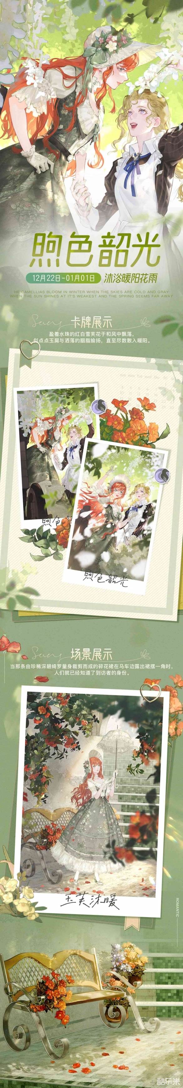 12月22日5:00-1月1日4:59,点击主界面「抽奖」进入「加冕典礼」奖池,使用「观礼券」抽取活动限定套装【洛维拉的荣光】【碎玉千卉】、限定卡牌【昨日与新篇】【煦色韶光】。