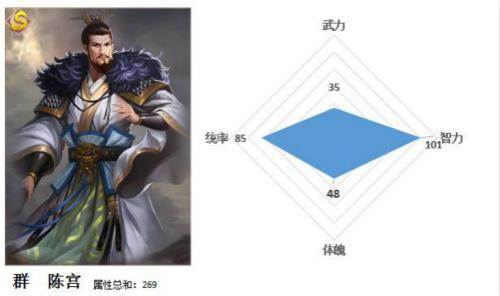 《一骑当千2》尊重史实,陈宫的人设非常契合历史,作为策士,其智力高达101,与较低的体魄及武力值形成鲜明对比;从技能来看,陈宫的特长主要是法术伤害及放毒,如手动技能是对敌方全体武将造成法术伤害并几率附加中毒效果,4星技能是对攻击目标造成法术伤害+几率中毒。战斗中陈宫宜与本阵营武将搭配,其5星技能是增加自身、我方吕布、我方高顺的初始能量,7星技能是自身+我方的吕布、貂蝉免疫眩晕。从以上分析可以看出,陈宫在任何阵型中都不适合打头阵,作为军师,后方的中军帐才是他最合适的位置。