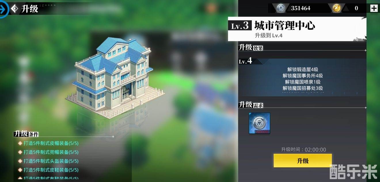 点击城市管理中心的升级按钮后页面的左边,一般是打造什么装备到一定的数量,升级城管中心之后能开启跟高的建筑等级和建造新的建筑