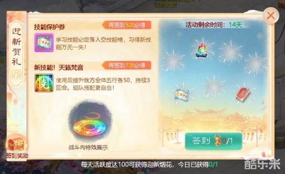 每日签到即可获得丰厚奖励,签到满7天即可获得全新技能书“天籁梵音”(绑定)