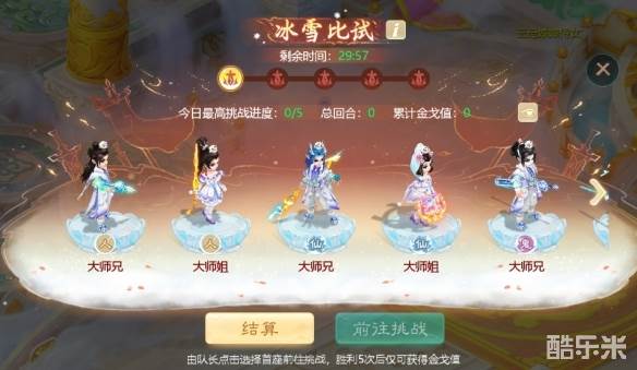 每天组队参与5场冰雪比试,可获取金戈值和雪花积分,还有机会获得独有称谓奖励呢!