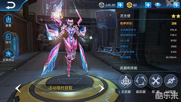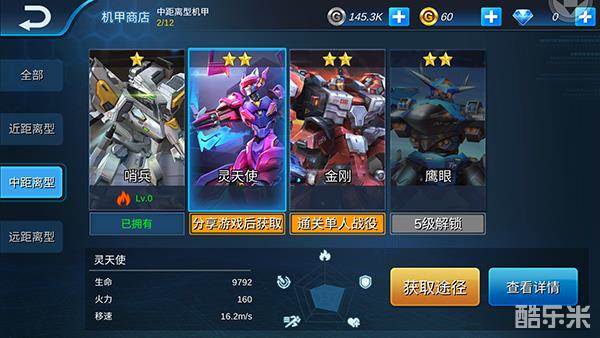 打开机甲库,点击选择中距离型-灵天使,可查看该机甲的详细信息。