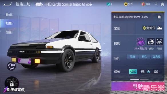 AE86是一辆集自充能、隐身、永久叠速等强力效果于一身的传说级竞速位赛车,风险与收益并存是它最大的特点。一方面,车手在大招期间进行漂移可获得持续的自充能效果,成功漂移超车时还可永久提升极速,实现一举两得,双重收益。另一方面,只要大招持续期间没有发生碰撞,也可获得大量自充能。随着碰撞次数的的增加,大招增益效果也将被削弱,碰撞达到4次及以上,更会额外损失耐久值,对后续竞速造成不利影响。