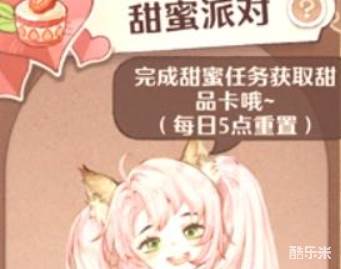 甜蜜派对的任务主要是激励玩家们完成每日任务的内容,达到数量之后会随机获得甜品卡。获得甜品卡之后还能玩刮刮乐,刮开对应的甜品之下就是能获得的游戏重要道具资源内容了。建议是多积攒一些甜品卡之后再去开奖,能够获得更多高品质的道具奖励。