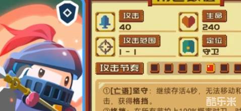 小花骑士属于玩家达到四段时才会触发的招募类型,所以前期只要先了解技能,开放招募之后再获取培养,本身属于守卫角色,在生命值方面比其他角色略高些,初始为240点,虽然不如另一个大哥坚硬,但是自身技能却依然非常好用。第1个技能坚守,属于亡语技能,只有在生命值归零时候才会触发,使其可以继续存活4秒钟,在这期间内获得格挡效果,但是不能移动和攻击。