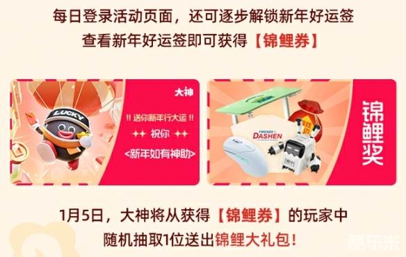 大神祝你新年行大运,每日查看新年好运签,还可获得用于抽取锦鲤大礼包的锦鲤券。1月5日将揭秘哪位幸运锦鲤赢得锦鲤大礼包,一举获得囊括千元电竞外设、大神周边服饰与网易游戏正版手边礼包在内的大奖!