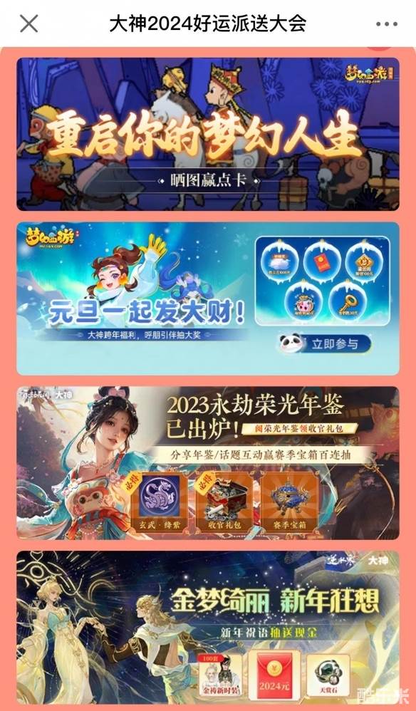 大神APP各游戏圈子也为大家准备了多重精彩活动,《梦幻西游》《蛋仔派对》《永劫无间》《逆水寒》手游等圈子也来与大家共庆元旦。在活动页点击【更多福利】即可进入游戏分会场,参与晒图、许愿、查收年鉴等活动,有机会获得游戏道具、现金红包等惊喜奖励!