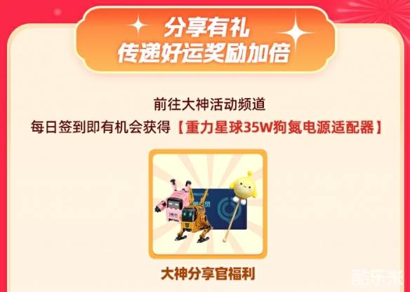 每日打卡,为今年好运加码!前往大神活动频道,每日签到即有机会获得重力星球35W狗氮电源适配器!分享好运,更多好礼等着你!扫码加入大神分享官,参与福利分享活动,就机会瓜分好礼!