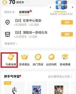 2、之后我们进入个人主界面,找到我们的礼券仓库,点击进入。在礼券仓库中我们可以查看获得的礼券。