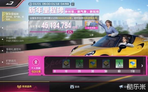 新年里程碑来袭,个人发力赢动作,共同合作得时装!1月1日至1月5日,个人在比赛中累计行驶达指定公里数,即可领取丰厚钻石、金币、零件等好礼,个人行驶公里数达200公里即可获得全新动作【次元突破】;全服车手累计公里数达6666万公里这一新年里程碑后,可免费领取极速盛典时装大礼包——限定纪念时装【冬夜清霜】!即刻上线跑图积攒里程,共同开往新年里程碑吧!