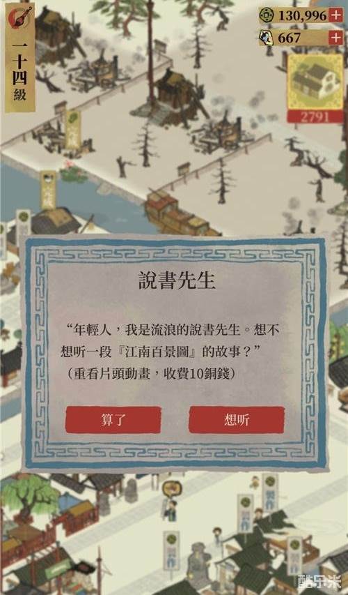 在城池中,偶尔会有说书先生神秘出现。如果你有幸遇到他,只需轻轻一点,他便会要求你付出10个铜钱。