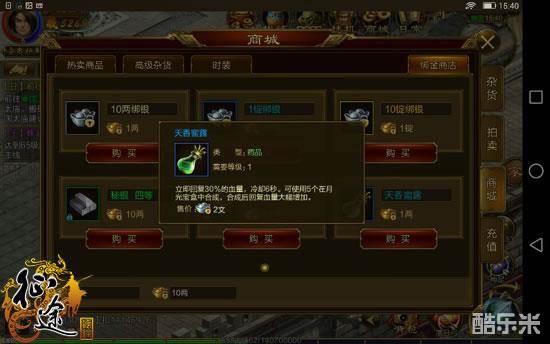 天香蜜露是一种非常有用的大药,在战斗中回血快慢,往往能够决定一场PK的胜负,经过合成的天香蜜露,更是玩家对决的决胜关键!不过一般玩家估计是舍不得投入绑金购买此类宝物,不过对于RMB玩家来说,再碰上比赛、活动,或者洗好打劫,有这么一味良药,定是不二选择。
