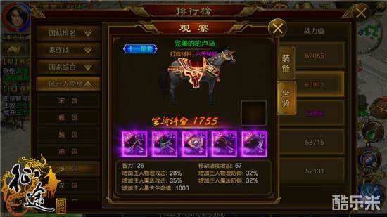 自从百级战马开启了装备打造功能,对于战马及战马装备的要求也不断提高,扇无忧的战马已经完成了11星套的打造,只差马缰绳就能达到12星套,距离实现装备及马装双12星套只差一步,因为是魔攻职业,所以马匹加点集中在智力上,智力加点26,速度增加57,坐骑评分为1755,主要攻防性能百分比加成均超过32%,属性已先人一等。