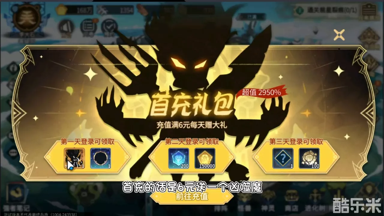首先来看一下首充礼包,首充是6元送一个凶噬魔,是不朽级别的,后期也可以进化成觉醒,第二天登录送200钻石,第三天再额外送一个随机的蓝色元核,奖励不多不少,我个人觉得一般般,这个凶噬魔也是可以帮助新手前期快速度过大多关卡的。