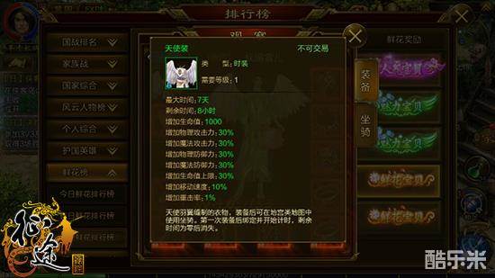 作为鲜花榜的翘楚人物,天使装是女神必备单品,毕竟一件天使装各项强大的属性加成能够达到30%,对于战力的提升是非常大的,虽男玩家们对此也甚是艳羡,不过鲜花榜显然是女玩家专属领域,也只能艳羡而已。妩媚雪儿的这件天使装是绿色品质,使用期限是七天,对其自身战力提升也起到了非常大的作用。