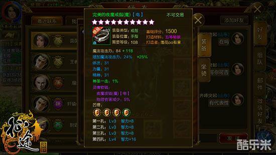 茵茵专属的装备打造为主,而图5展示的这枚戒指,是她少数的通过拍卖获得的装备,五等材料的夜魔戒指评分高达1500,魔攻基础值为202,魔攻提升百分比接近50%,而灵魂锁链激活后的物伤减少5%,对于魔攻职业来说也是非常重要的。