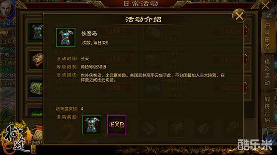 角色达到30级后,在凤凰城侠客岛传送员处可接取任务侠客岛,世外侠客岛,比武赢奖励。作为日常活动任务活跃度贡献者之一,侠客岛不光可以获得经验值奖励,也可以获得绿装奖励,获得绿装奖励的前提是,在侠客岛的战场中击杀三十人。