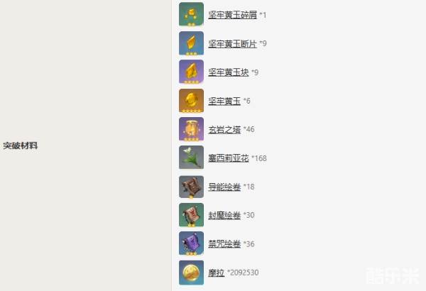 40级突破材料:坚牢黄玉断片3、玄岩之塔2、赛西莉亚花10、导能绘卷15