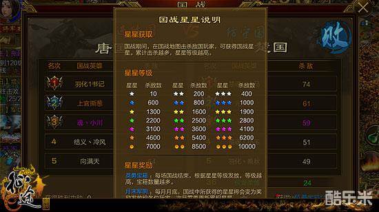 在国战期间,国战地图上击杀敌国玩家,就可以获得国战星星。累计击杀越多,星星的等级就越高。每场国战结束,根据星星等级会发放英勇宝箱,星星等级越高,宝箱的数量就越多。需要注意的是,国战星星是月底清空的,累计的星星会变为奖励发放给所有玩家。有了国战星星的新规则后,国战的参与奖励会更多,所以每场国战都要奋勇杀敌,争取积累更高的星星等级。