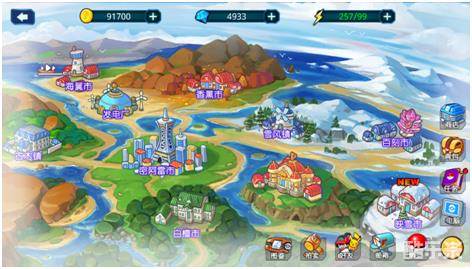 看见这个可爱的“喵喵”热气球了么?,点击它,训练师就可以进入世界地图进行冒险了。在这里,大家可以捕捉心仪的精灵和挑战各地的精灵训练师以获取通关奖励。冒险活动是获取人物和精灵经验最主要也是最常规的途径,让我们和自己心爱的精灵宝宝们一起战斗,一起成长吧!
