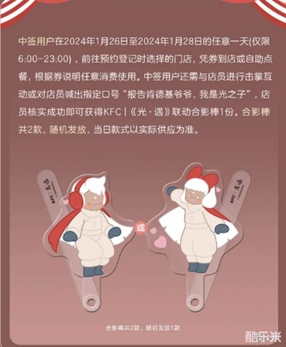 玩家还可以通过光遇游戏内的联动主题页面填写个人信息,获得参与门店周边兑换的资格,在26日至28日期间,中签用户可以前往预约登记的门店与店员进行击掌或喊出指定口号“报告肯德基爷爷,我是光之子”,即可获得联动合影棒。