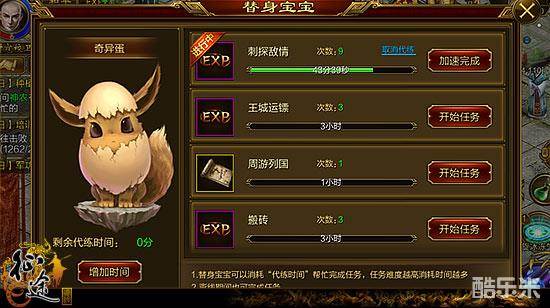 日常任务是大家平时获取经验值的主要方式,但是像有些日常任务如暗杀太子等,需要去敌国,对于有些形单影只的玩家来说,这样的任务完成率并不高,这时候,替身宝宝就派上用场,帮助大家完成任务。根据任务难度不同,所需花费的时间也不同。