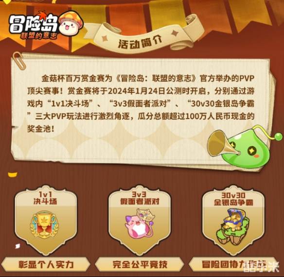 来岛寻宝的冒险家们,都有踏上人生巅峰的梦想,游戏内的“金菇杯百万赏金赛”就是你圆梦的舞台!作为全岛顶尖的PVP赛事,游戏做到绝对0门槛报名,你可以参与包括1v1决斗场、3v3假面者派对、30v30金银岛争霸赛在内的三大赛事项目,体验热血沸腾的竞技瞬间,更有机会瓜分100万现金大奖。喜欢单打独斗,杀出重围独享1W现金,没问题~与团队一起分享3W奖金,同样欢迎!还有限定称号可以闪耀全岛,做冒险岛上最靓的崽。
