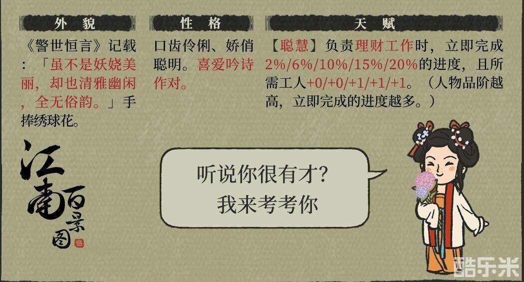 1、苏小妹的基础属性并不高,只有理财是良级的,优先级不高;