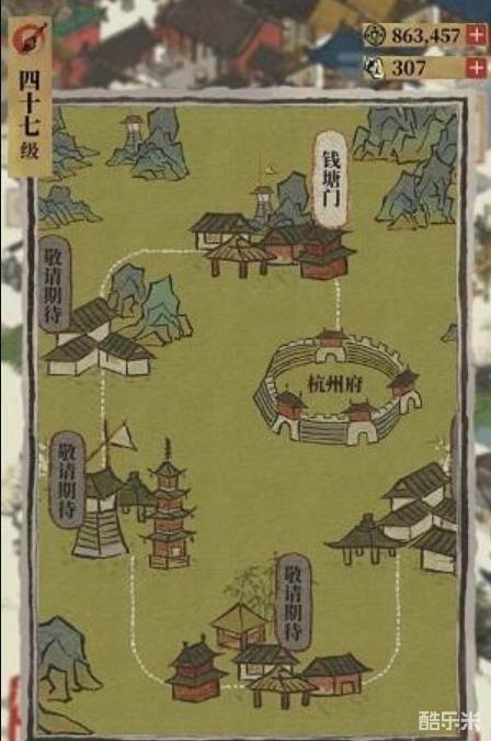 1、藕粉工坊在杭州探险的第一张,首先打开地图,前往钱塘门;