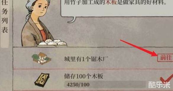 2、然后有个任务列表,需要前往锯木厂、储存100个木板;