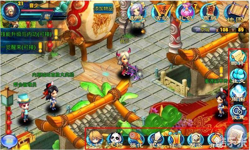 主要的功能表都集中在屏幕右下角的位置,基础功能有人物、宠物、强化、技能、任务、帮派和背包等。涉及社交的功能有邮件、社交、周围等。