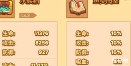 2、第二个组成就是我们的水族箱和鱼类图鉴,也就是你所捕获的鱼类存放的地方,各种种类不同的鱼类能够给予各项基础属性和特殊属性的提升也不同。 其次的话就是咱们的一个图鉴了,图鉴也能对咱们的四项基础值有一个大的增幅。以及上面水族箱有一个增加近百分之十攻击力,也是一种增幅方式。这个应该是小编的虎鲨所提供的增幅。除了攻击之外还有防御值、生命值、速度等,生长长度越大的鱼所能够提供增幅值也就越大,所以小伙伴们在选择相同鱼类的时候,就选择长度最长的那一条。