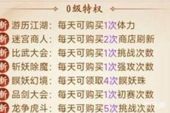 最基础的0级就已经有不少特权了,例如每天能买1次体力,买2次商店刷新、1次挑战次数、1次强攻次数、4次瞑妖珠的领取次数、2次招财次数、2次金镐开采机会。
