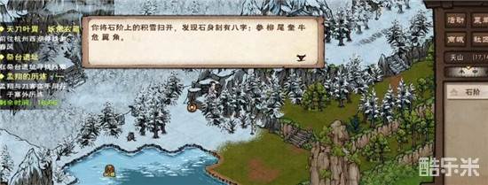 烟雨江湖祭台遗址是最近天山任务的一个部分,需要玩家机关,之后就能进入山洞进行搜索,可以得到不少东西,烟雨江湖祭台遗址机关密码是多少?下面酷乐米小编就向大家介绍下烟雨江湖沂漠石林位置介绍,一起来看下吧。