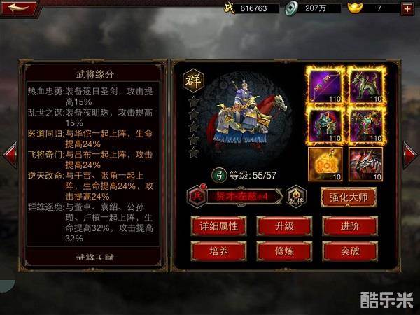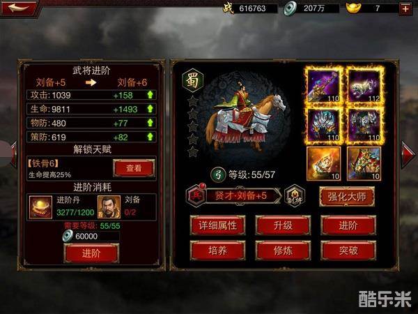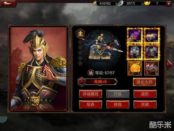 ◆ 装备框下方,在这里可以对武将进行升级、进阶、培养、修炼、突破五种方式的提升。升级是武将最基础的提升方式,每升一级武将的各项基本属性都会获得增强。当武将等级达到要求条件时,就可以进阶。进阶需要消耗进阶丹,每次进阶都会使武将产生质的飞跃,属性大幅提升,并习得新的天赋技能。玩家平常活动任务中获得的培养丹道具,则可以在培养功能中使用。通过日积月累,可以有针对性地去提升武将的某项属性。修炼则与培养相反,是一种厚积薄发的提升方式,使用修炼石来增加武将的修炼值,当修炼值达到升级条件时,武将便会提升修炼等级。每次修炼等级的提升,都会大幅提高武将的属性,并且武将的技能也会随之升级。主公与橙色品质以上武将达到50级后可进行突破,突破需消耗突破道具、突破石、银币,突破至一定等级后,突破还需消耗同名武将卡,突破后增加武将附加属性,提高武将星级。