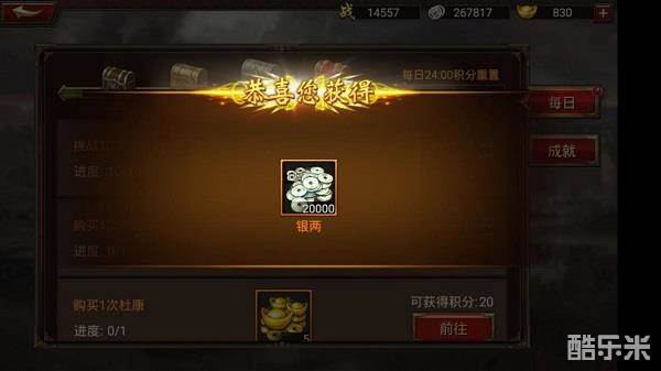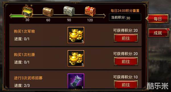 日常任务种类繁多,难度也各不相同,包含完成副本、强化装备、购买道具……每完成一个日常任务,都能获得道具奖励和一定的积分,积分达到一定数量,还能开启相应的宝箱获得元宝、急行军令、橙将碎片箱等珍贵道具哦~