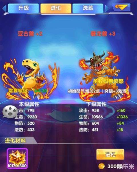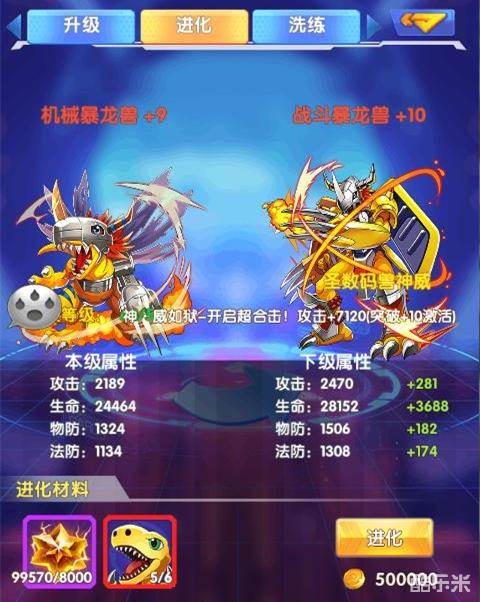 每次进化后,不光可以增强究极数码宝贝的攻击,生命,物防与法防,还能增加初始怒气值,伤害减免提高,提高全体友军生命、命中、防御,大幅度增加全体宝贝的战斗力。不过每次进化,除了必须的材料外,还需要相应的究极数码宝贝进行进化,这就需要在商店中进行获得,或是碎片合成咯。